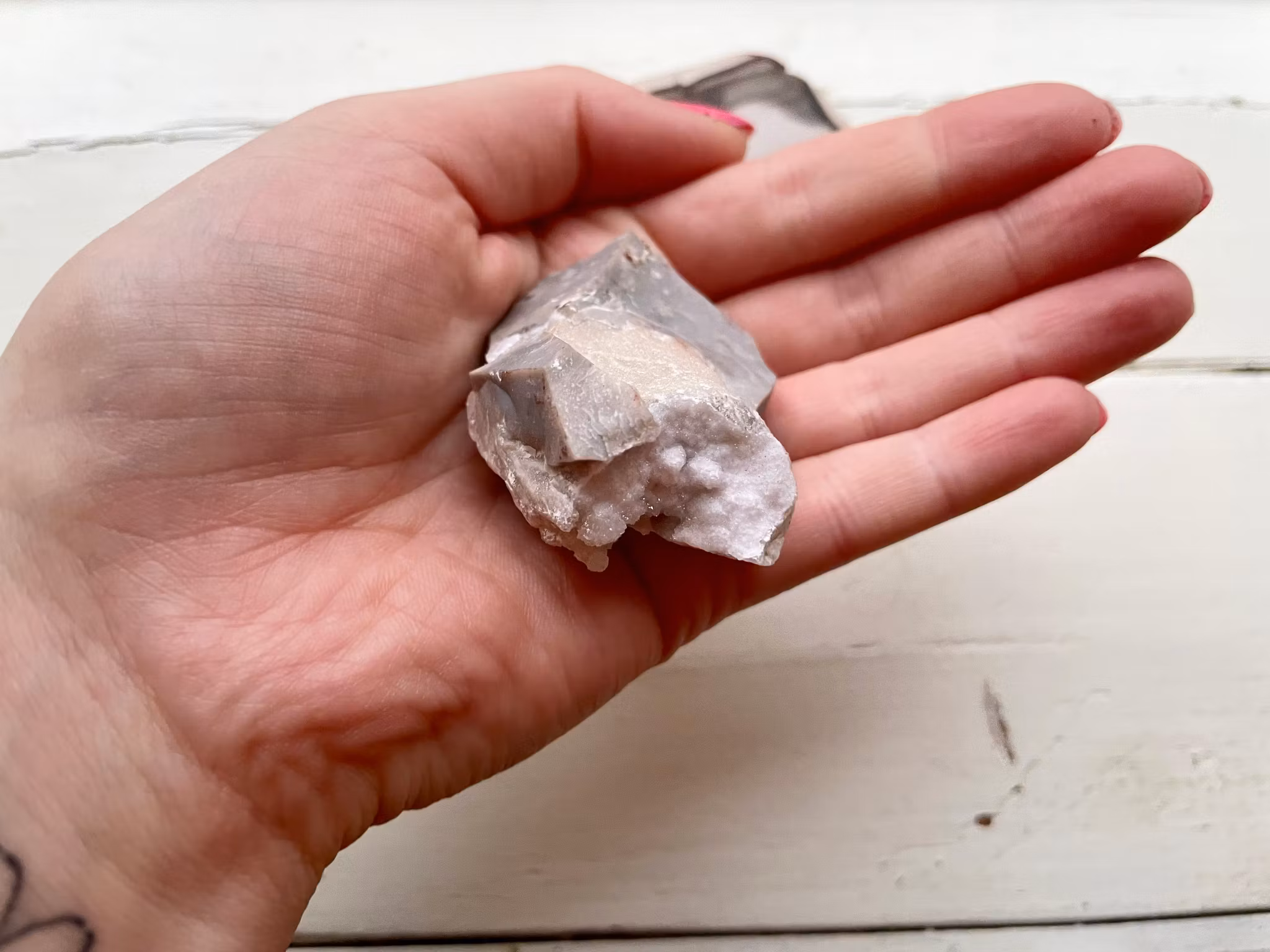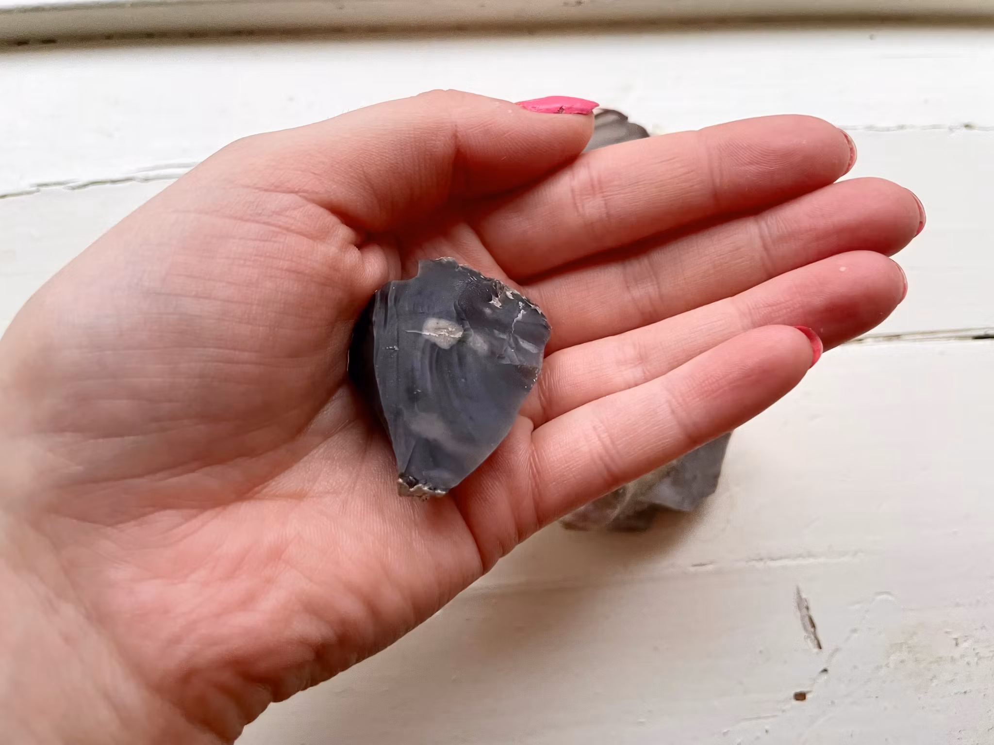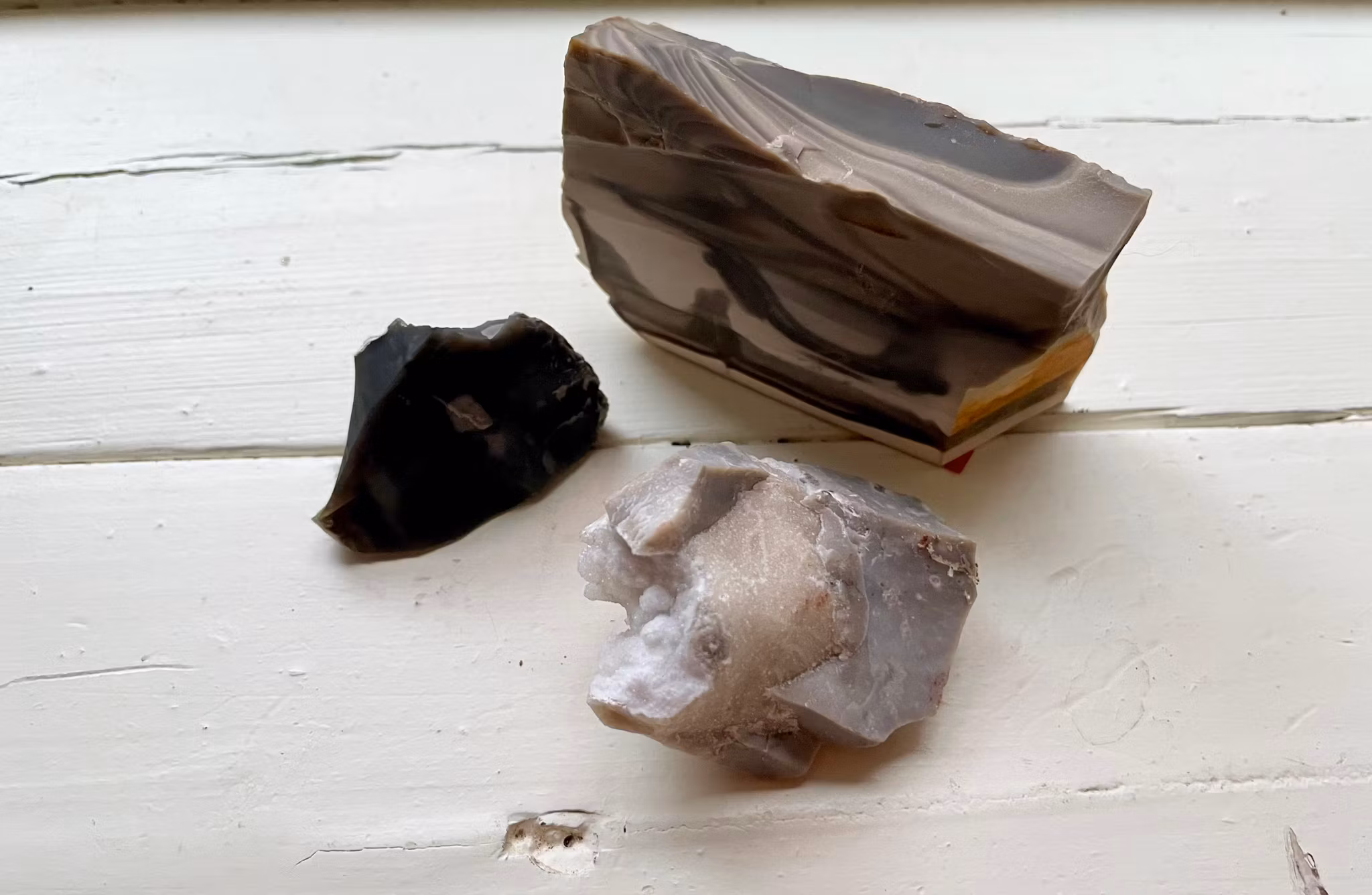 Fina flinta stenar i olika former och färger. Flintan som väger 21g är upphittad i Limhamn. Flintan / bergkristallen som väger 50g är upphittad i Ivarnby. Flintan som väger 147g är upphittad i Polen.