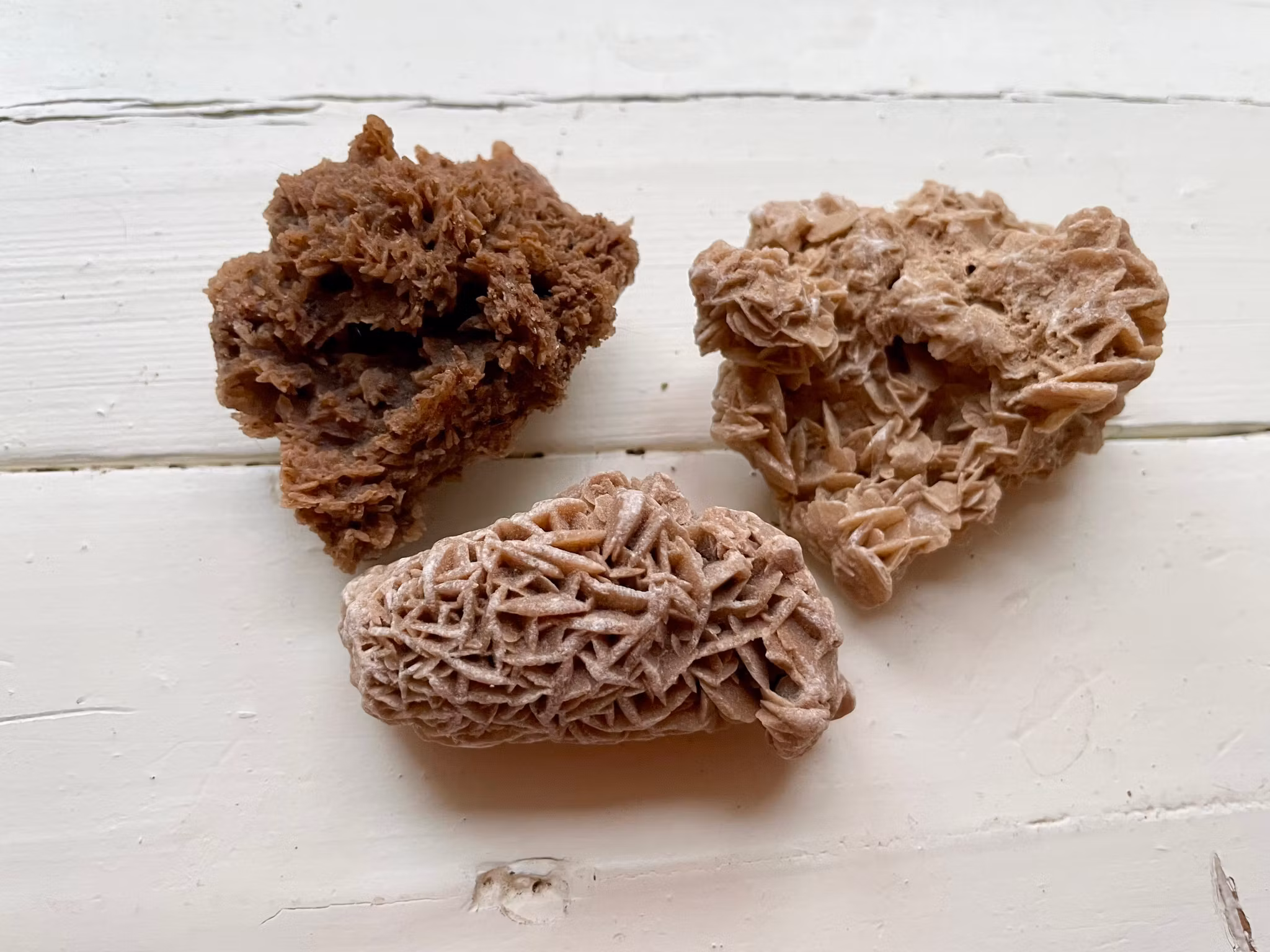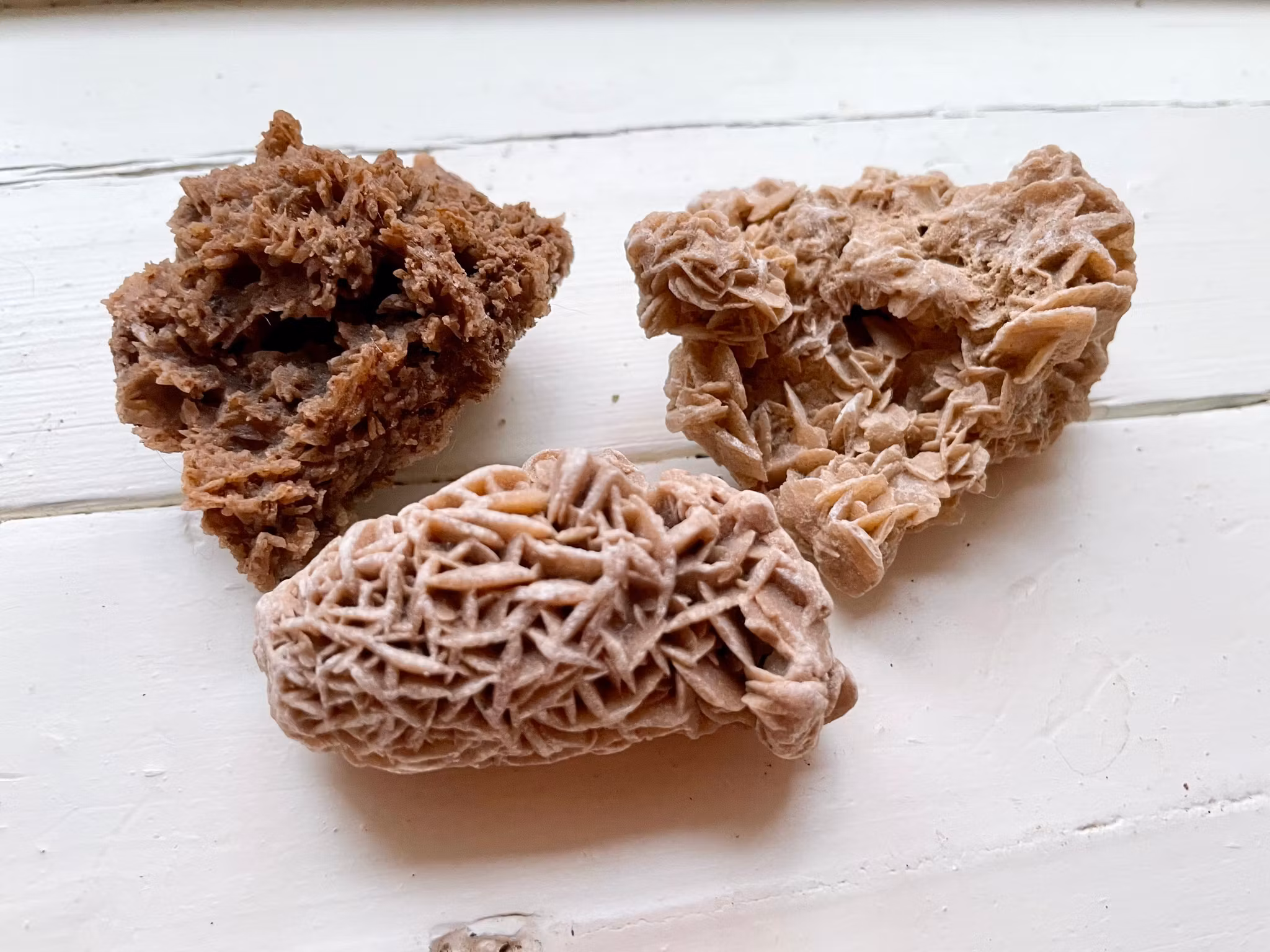 Fina ökenros kristaller i olika storlekar. Kristallen som väger 53g är upphittad i Huerte Venha Kanarie öarna. Kristallen som väger 57g är upphittad i Nordamerika. Kristallen som väger 61g är upphittad i Sahara Tunisien.