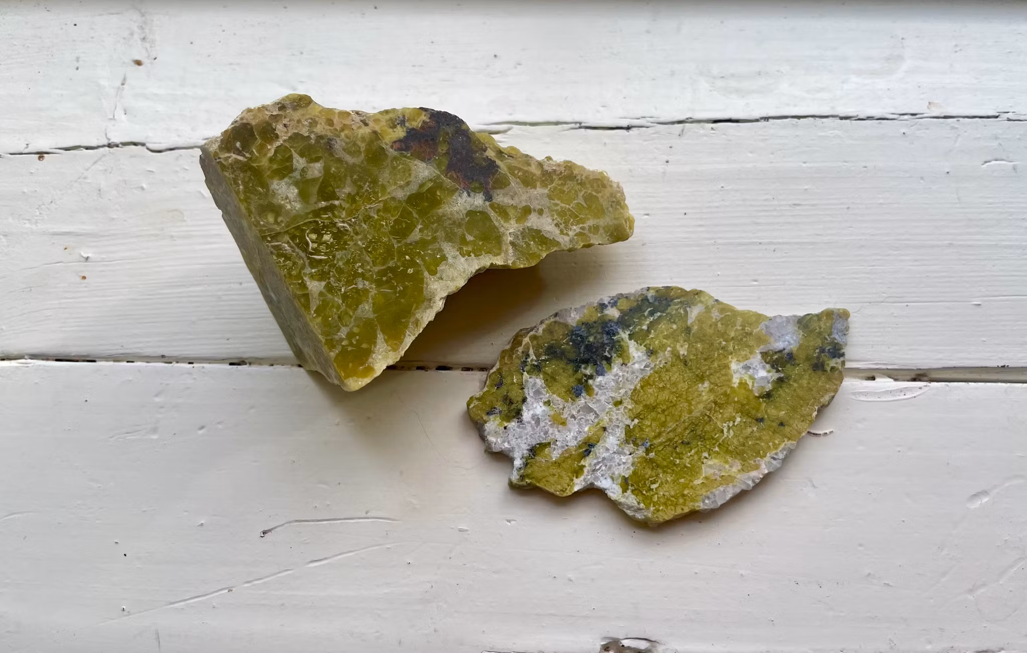 Fina gröna serpentin i två olika storlekar. Den som väger 27 gram är upphittad i Norge Snarum. Den som väger 128 gram är upphittad i Norge Modum.