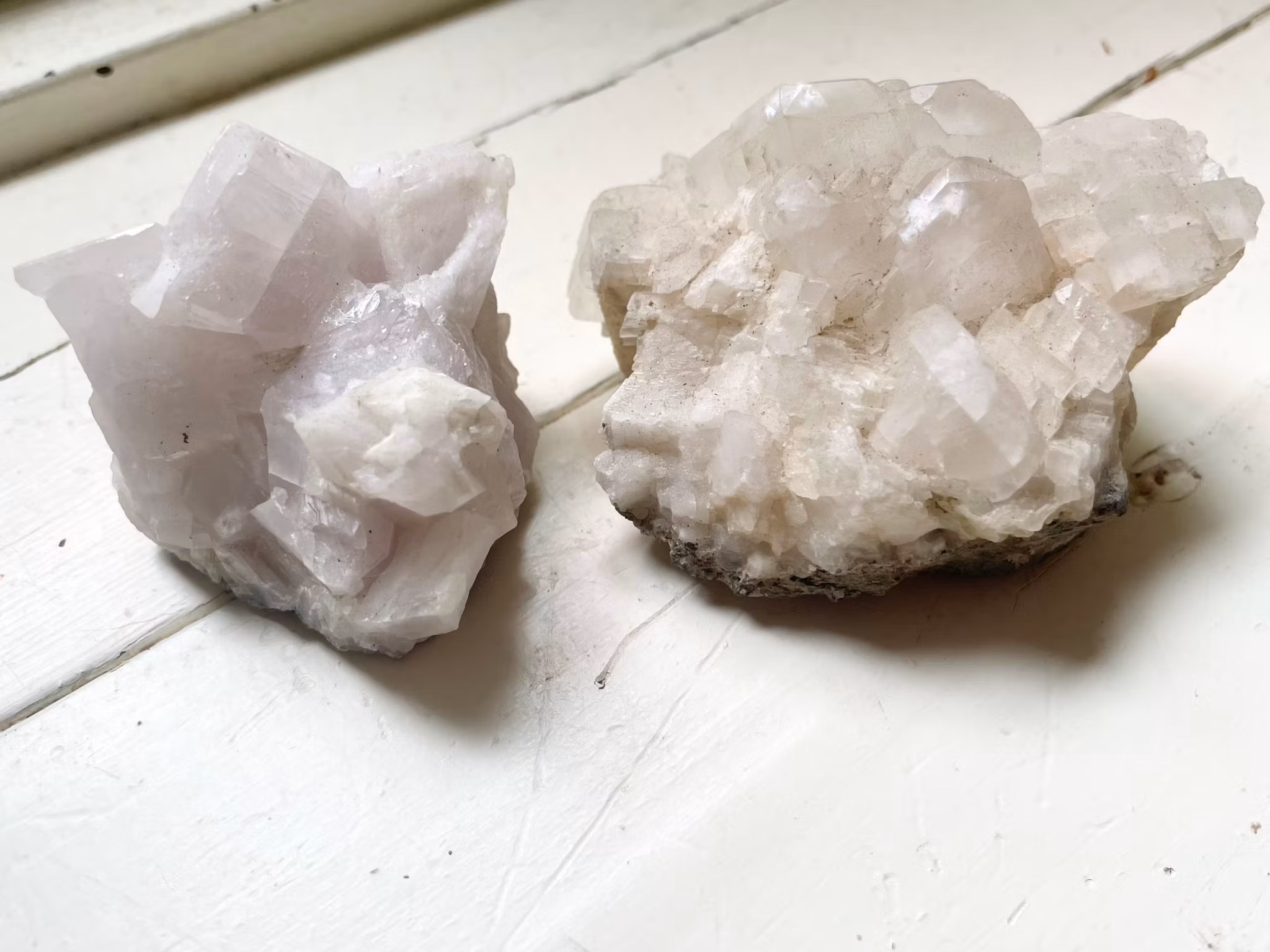 Fina kalcit kristall kluster i olika storlekar. Båda kristallerna är upphittade i Rönnarp Sverige.