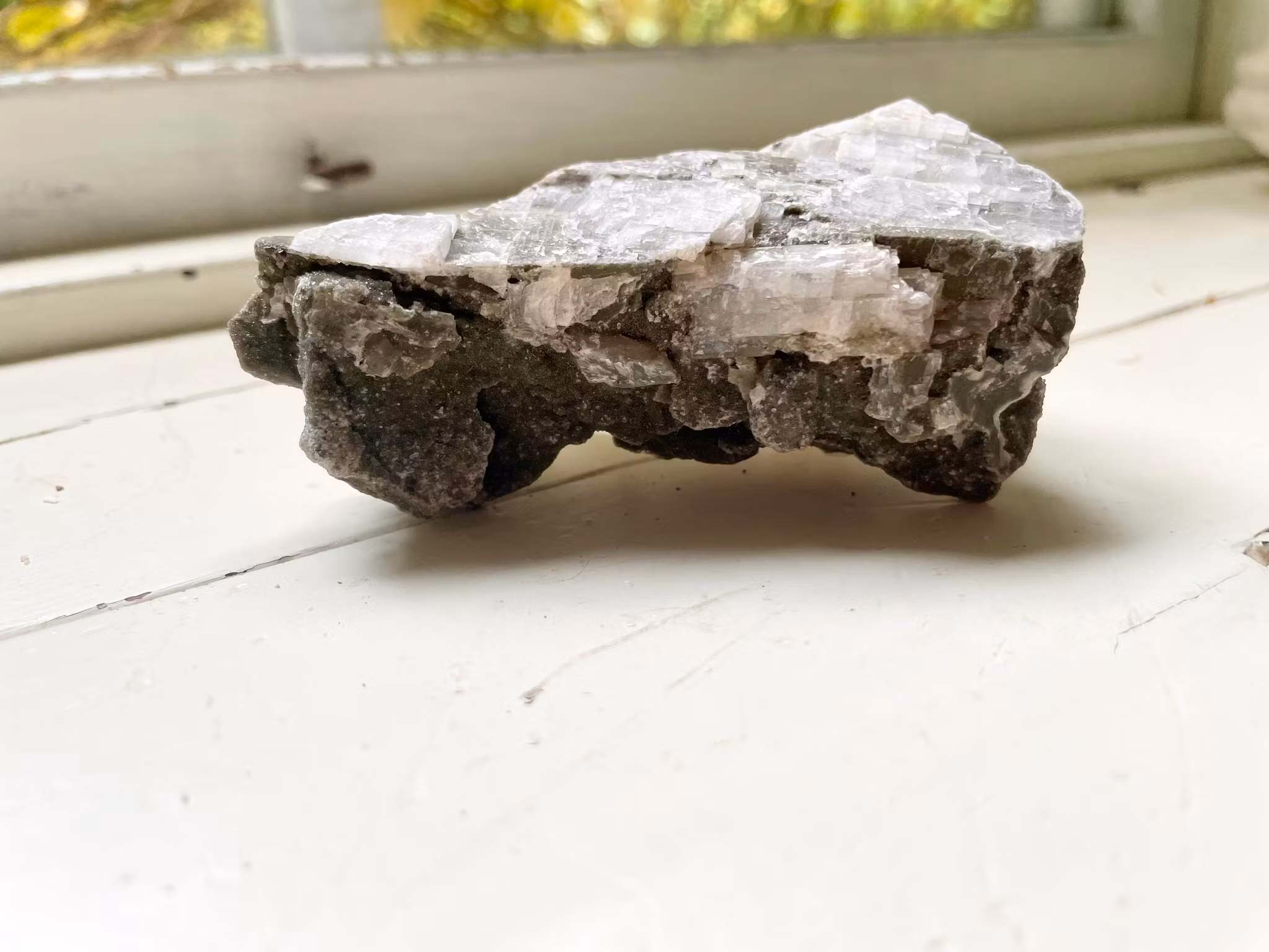 Fin rå kvarts kristall kluster som väger 149 gram och är i färgen vit och grå. Den gråa sidan är fylld med små glittrande kristaller. Kvartsen är upphittad i Rönnarp Sverige.
