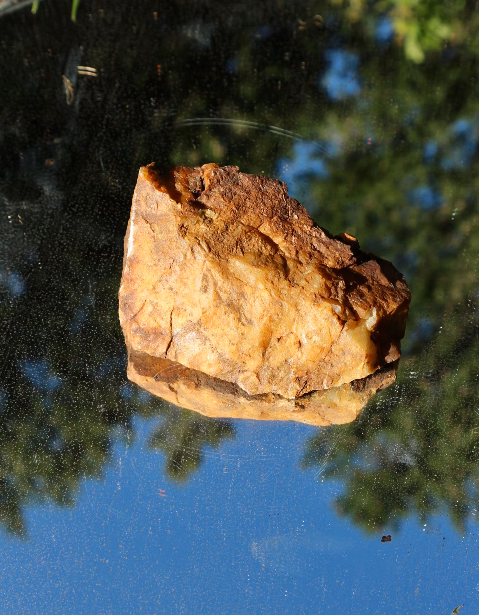 Orange rå karneol med ett fåtal kristaller i storleken 290g och 10x5cm.