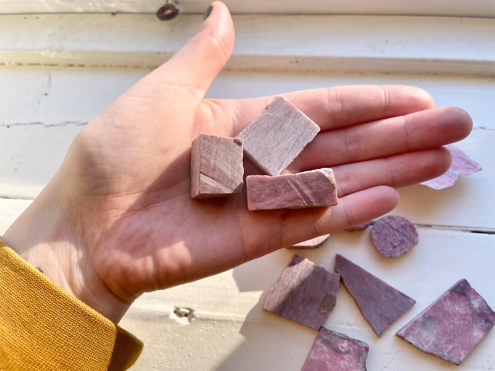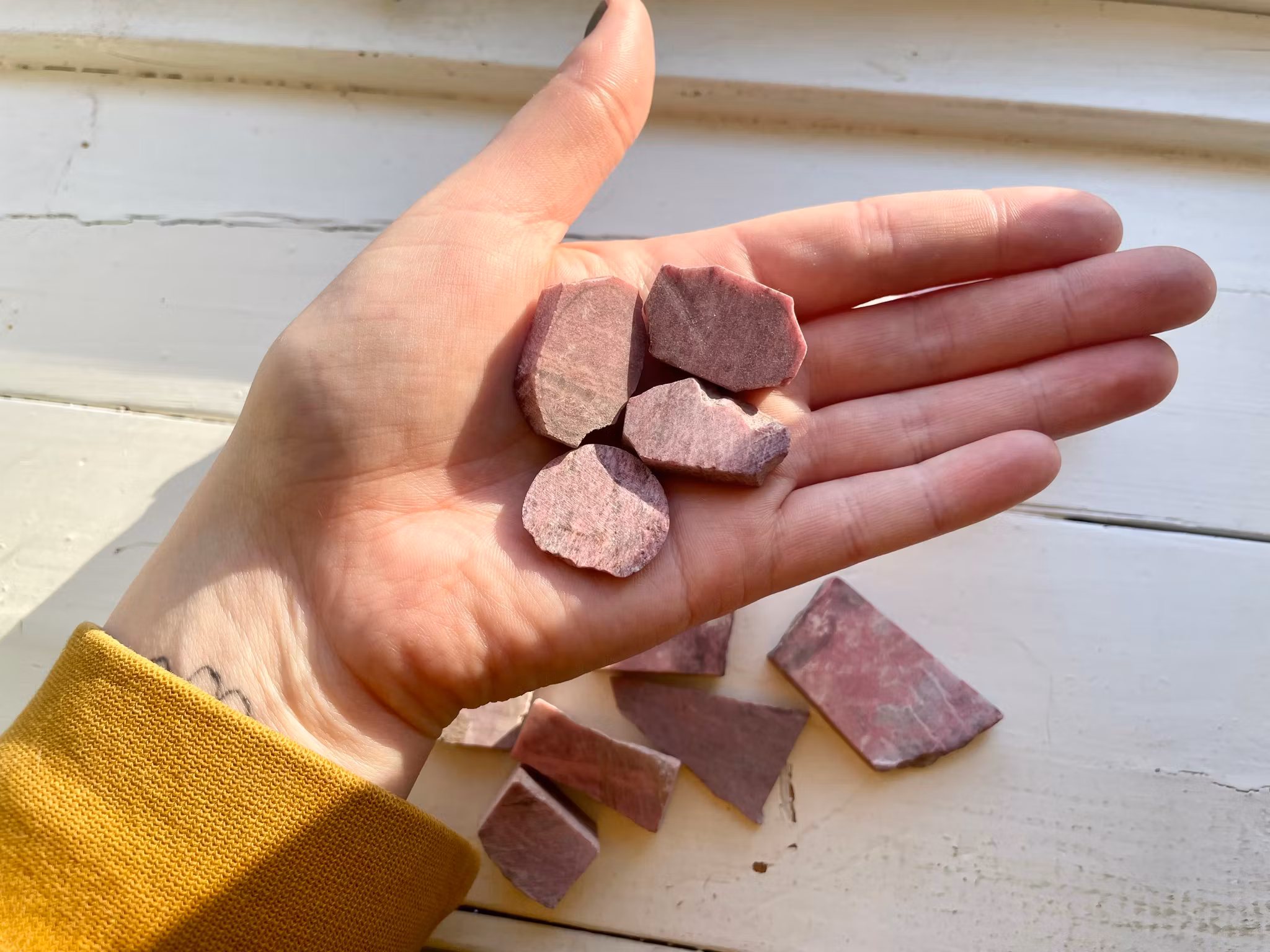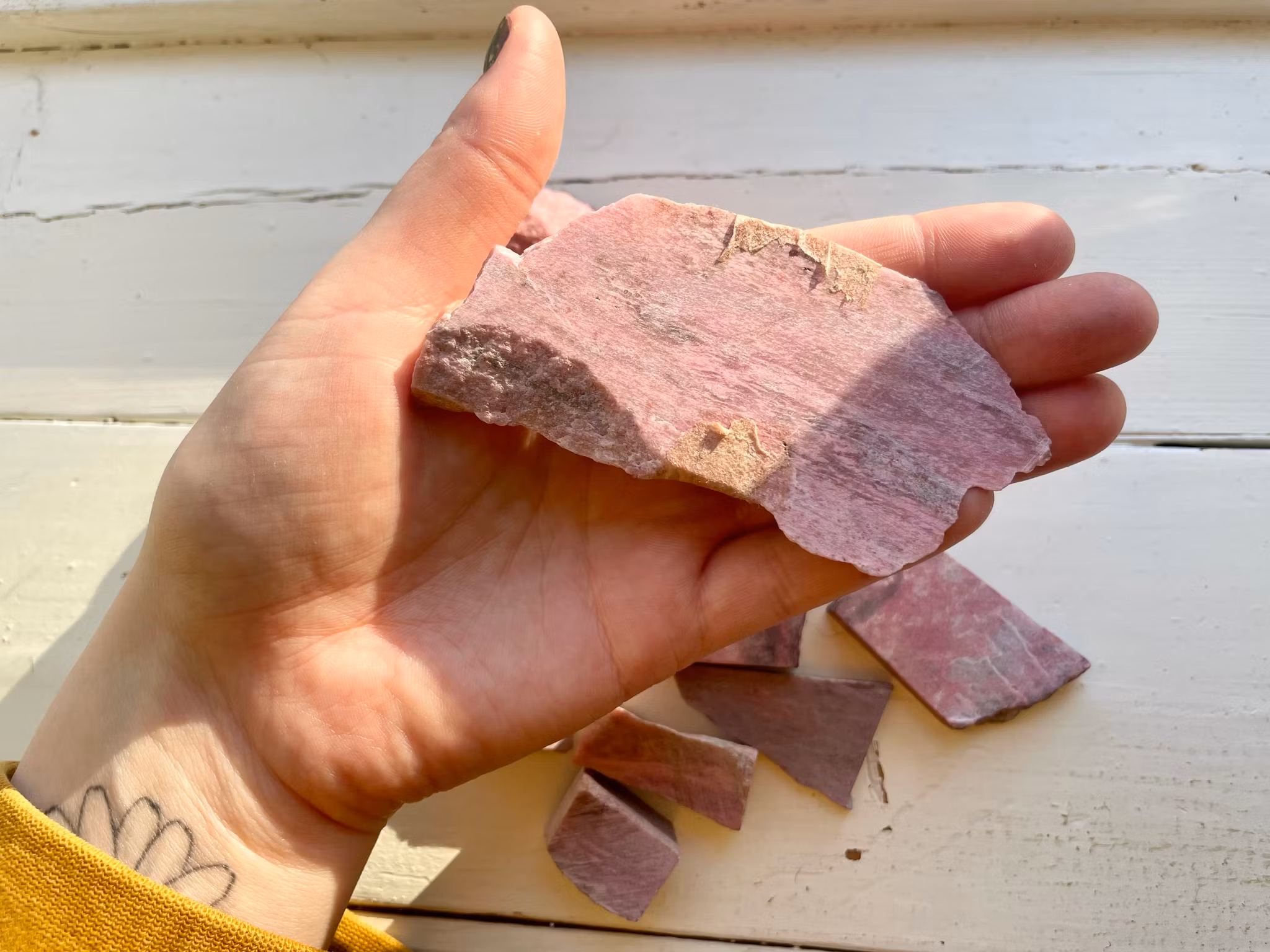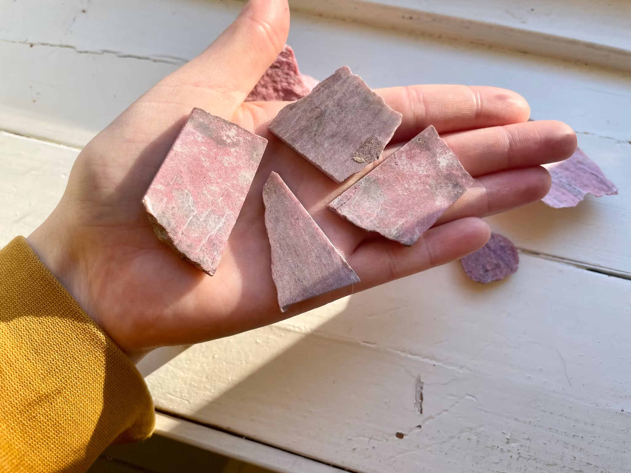 Fina rosa glittrande thulit i olika storlekar och former. De mindre kvartsen säljs i paketpris. 50g innehåller 4 stycken, 43g innehåller 3 stycken och 29g innehåller 4 stycken.