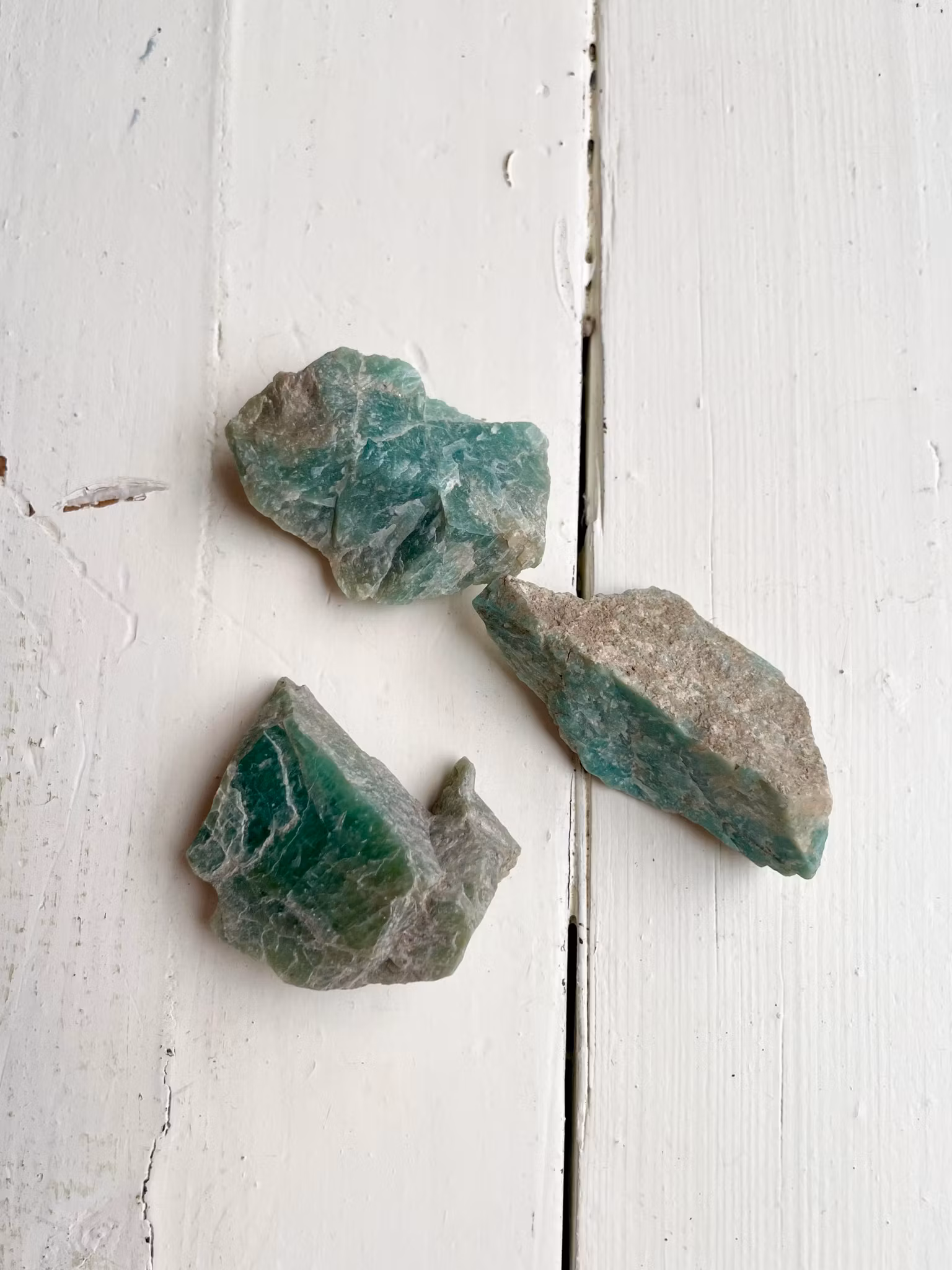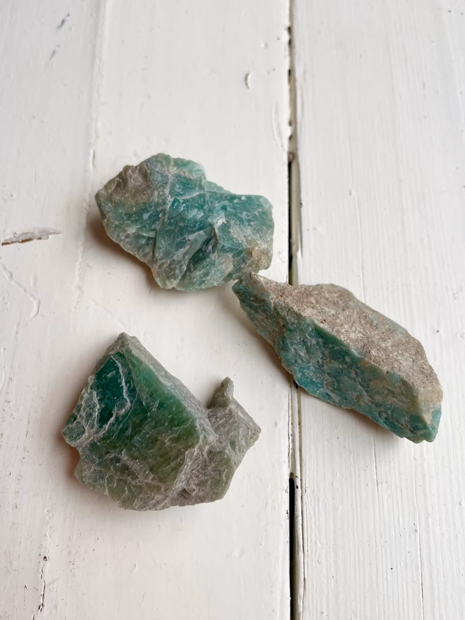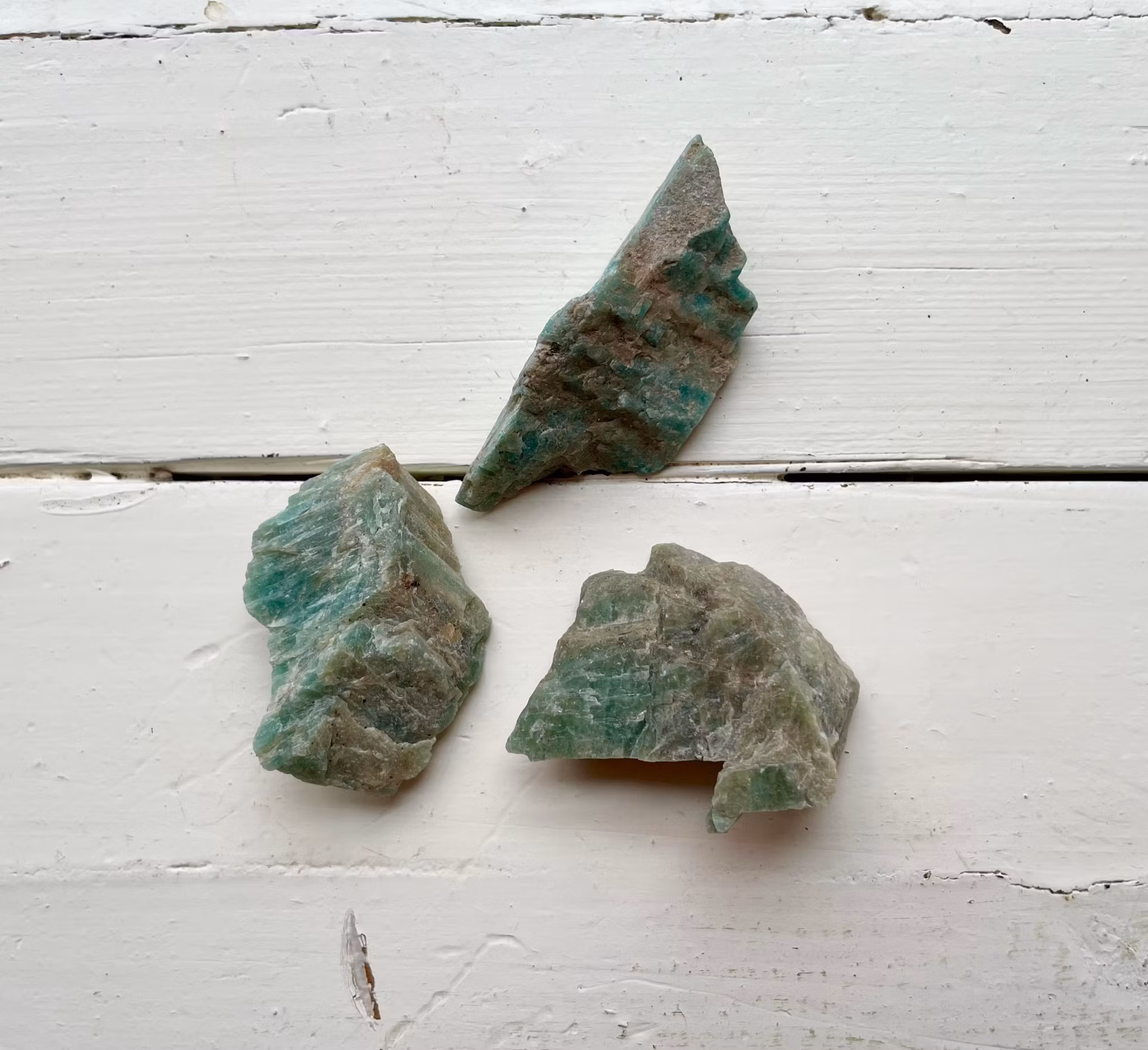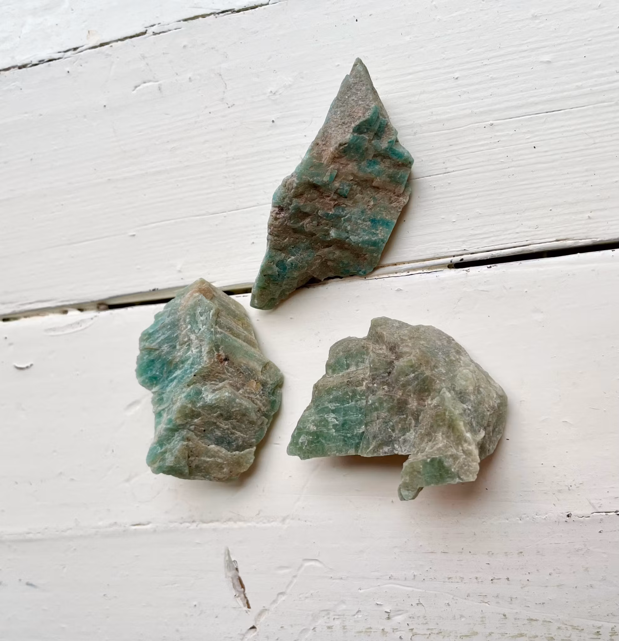 Fina råa amazonit bitar som är upphittade i Sverige, Skureboda. Kristallerna väger mellan 20-29g.