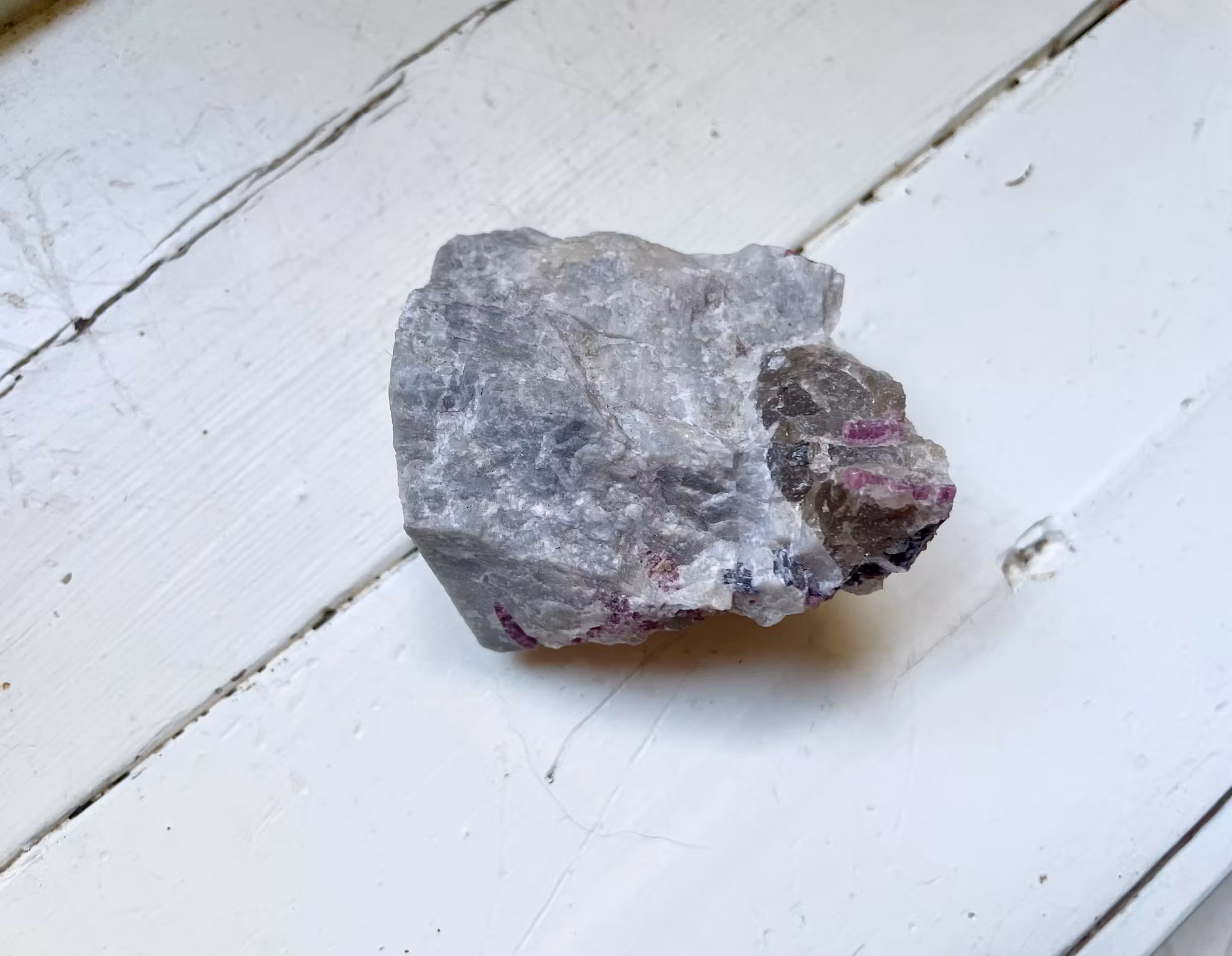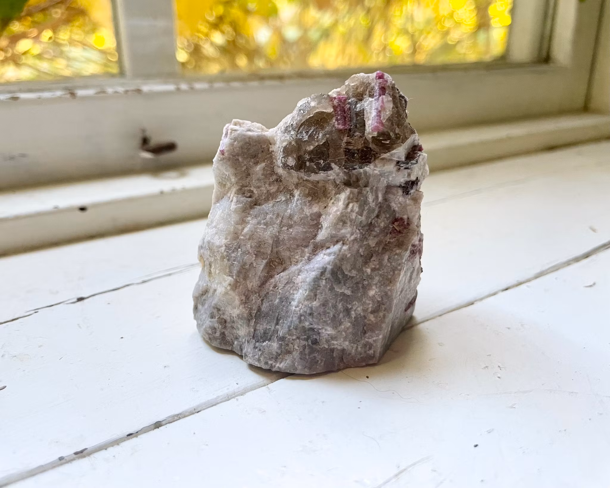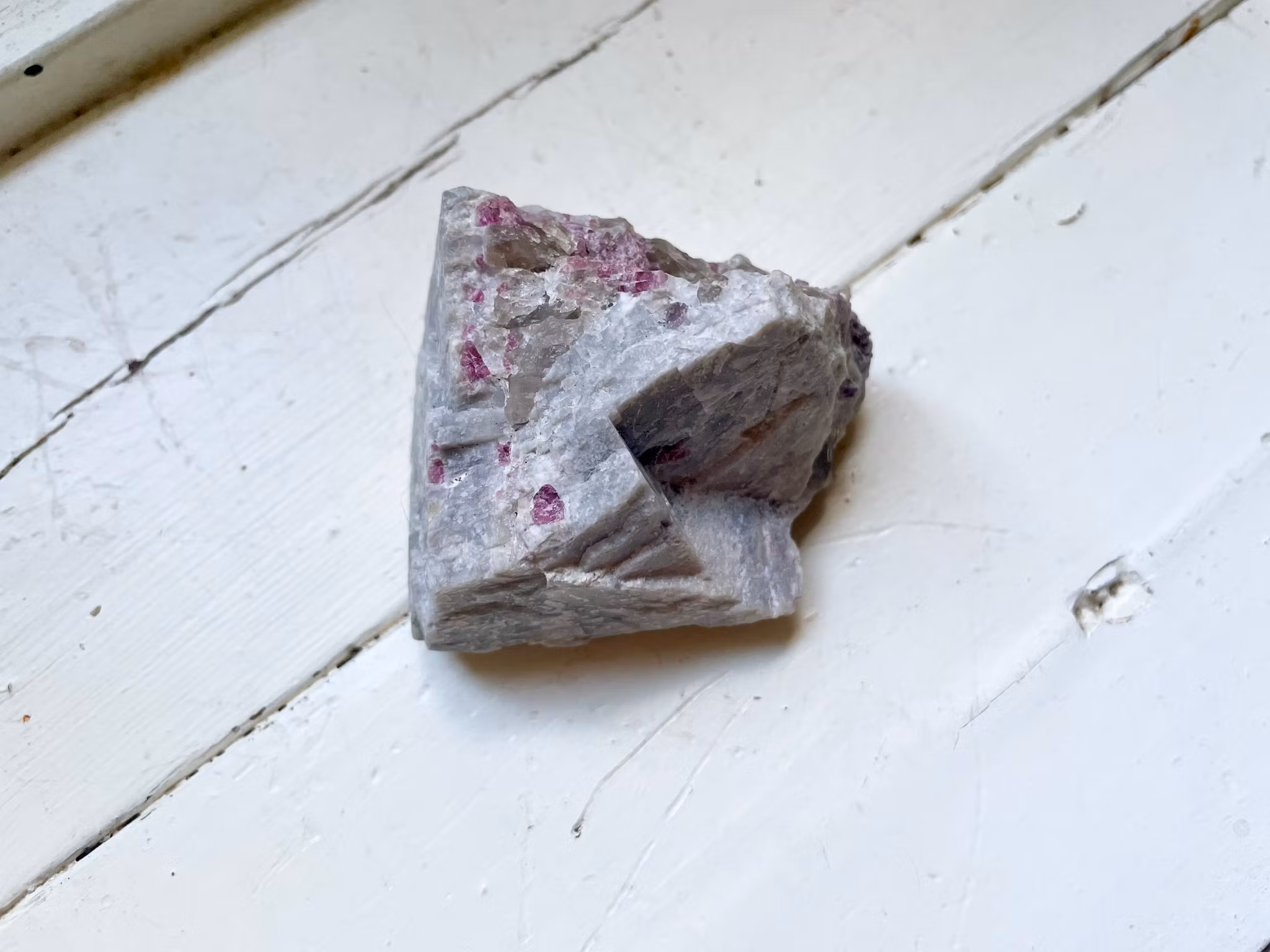 Fin Turmalin kvarts i grön nyans med röda detaljer. Den väger 125 gram.