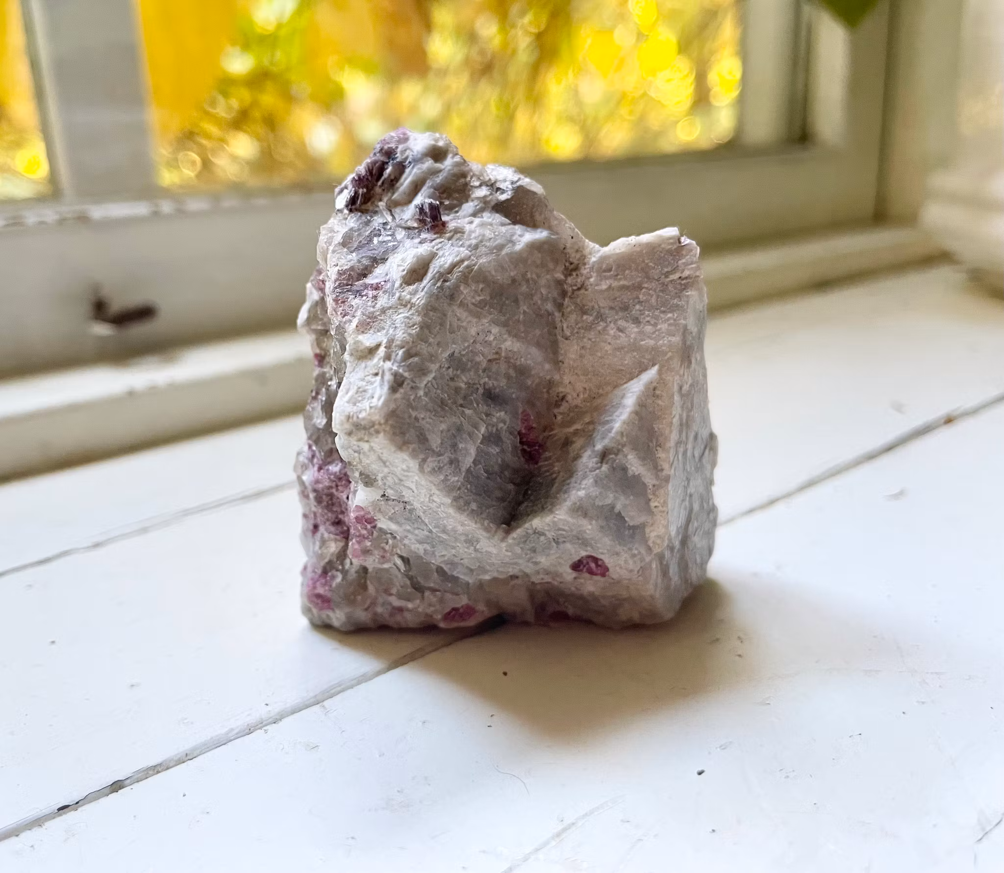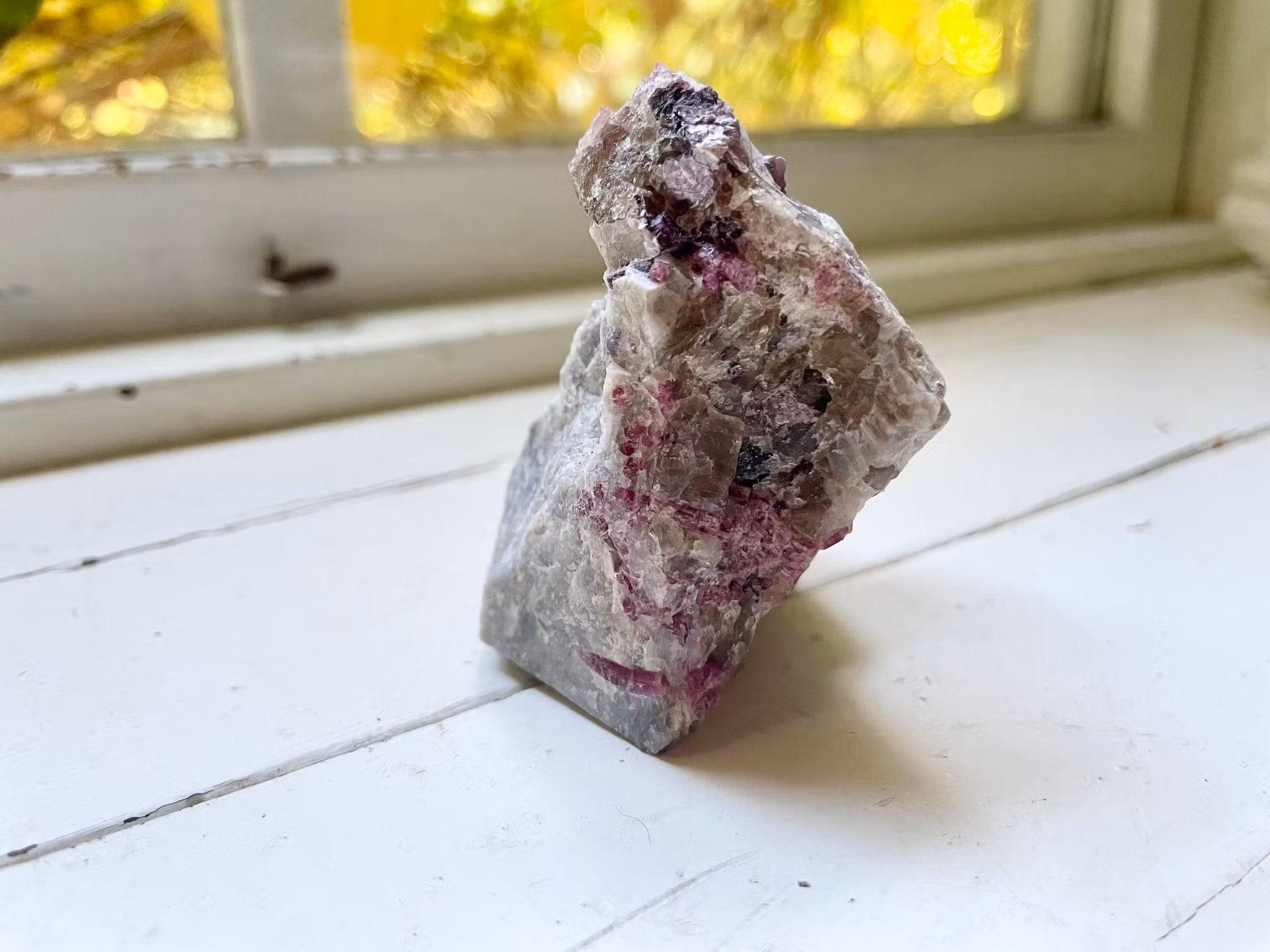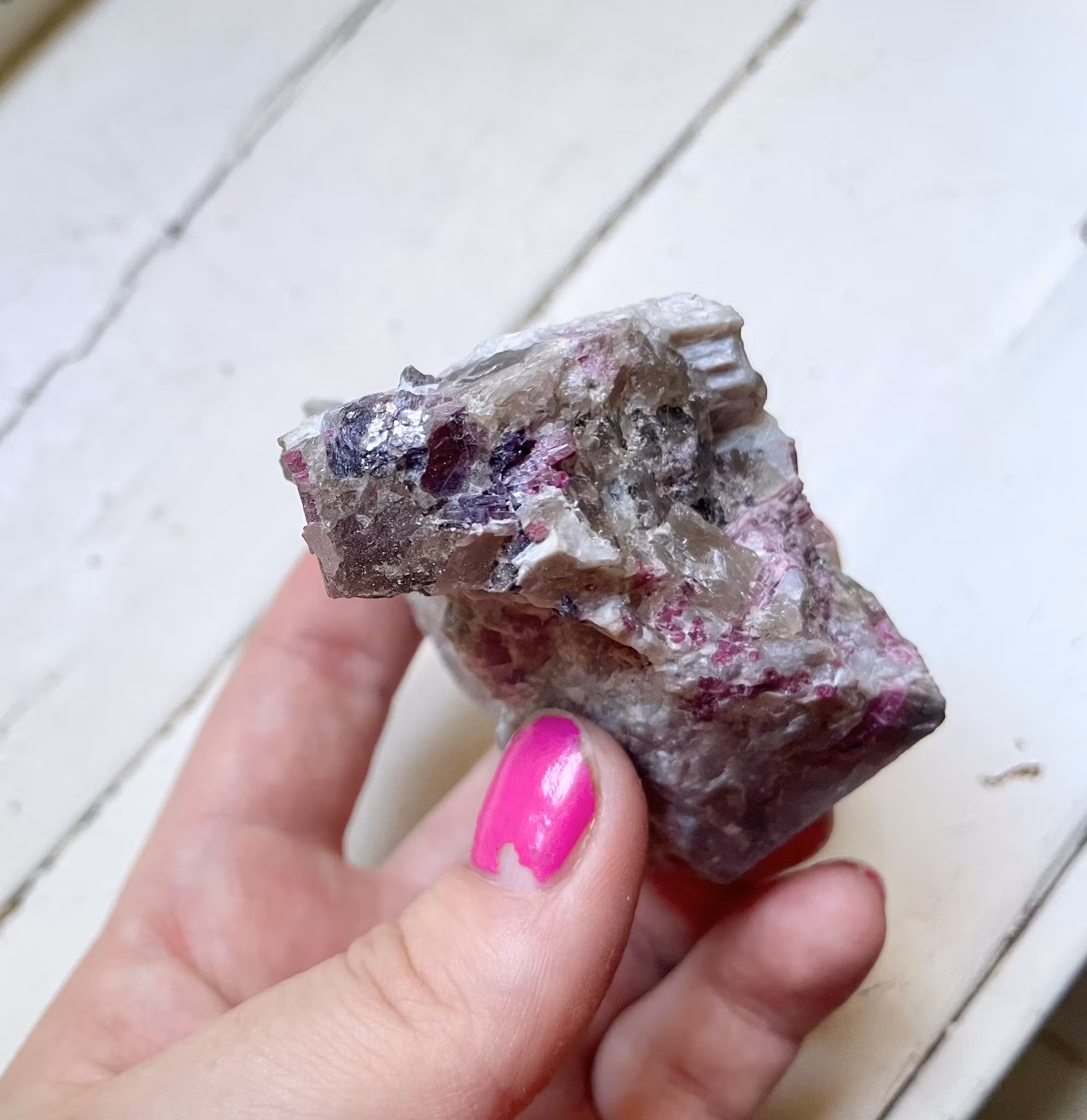 Fin Turmalin kvarts i grön nyans med röda detaljer. Den väger 125 gram.