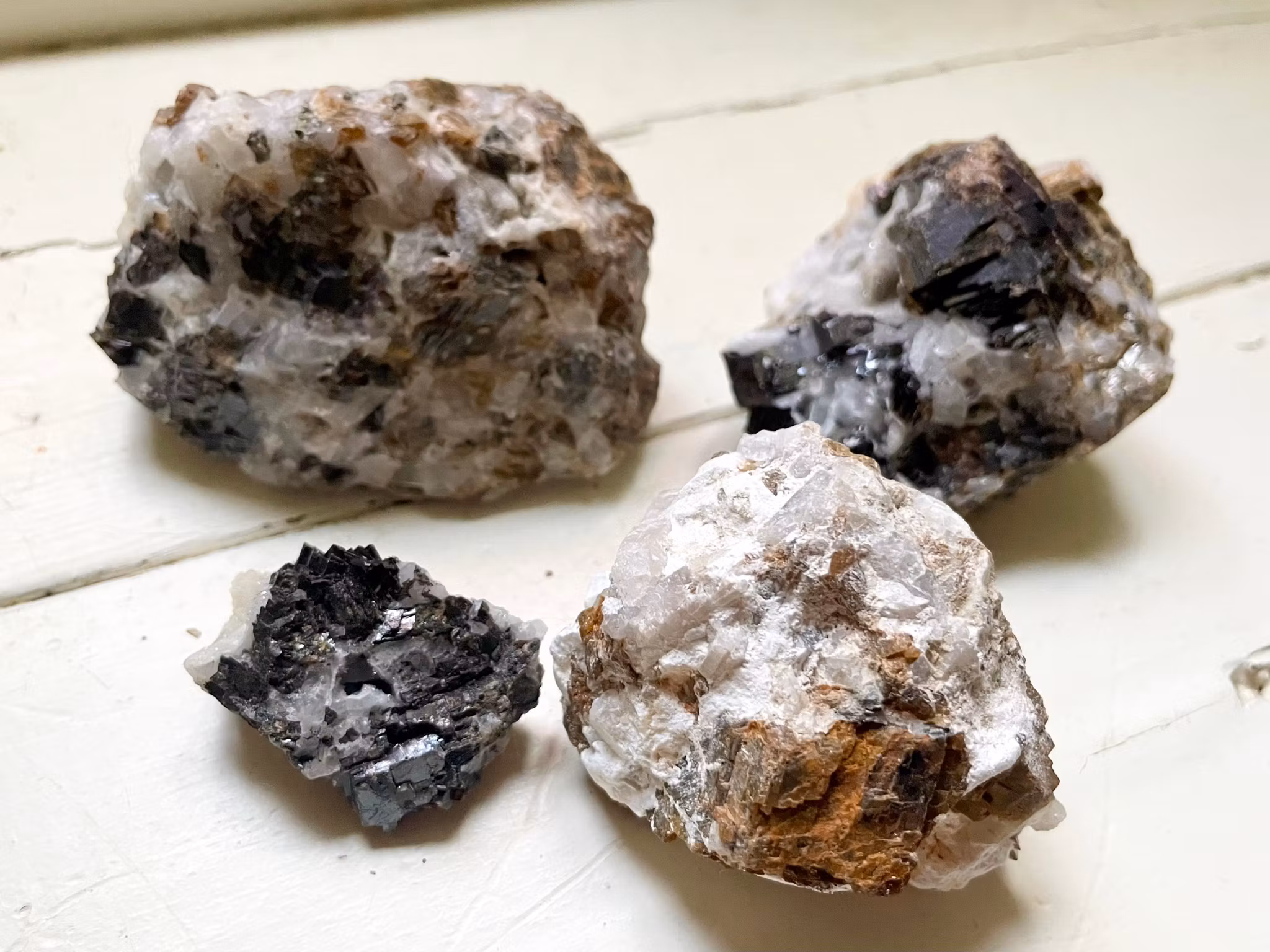 Fina Siderit kvart med kristaller i olika storlekar. Alla fyra är upphittade i Ivigtut Grönland.