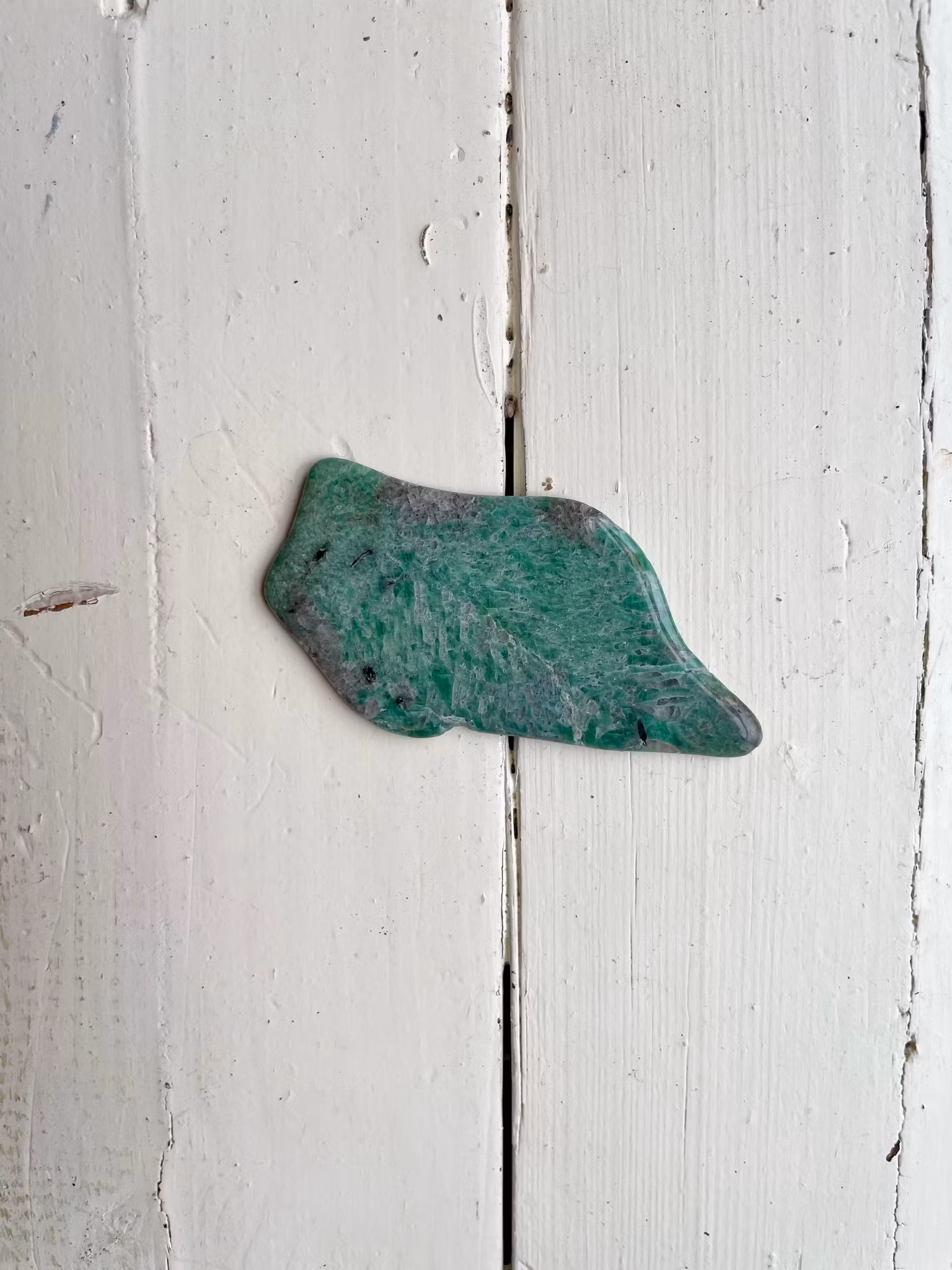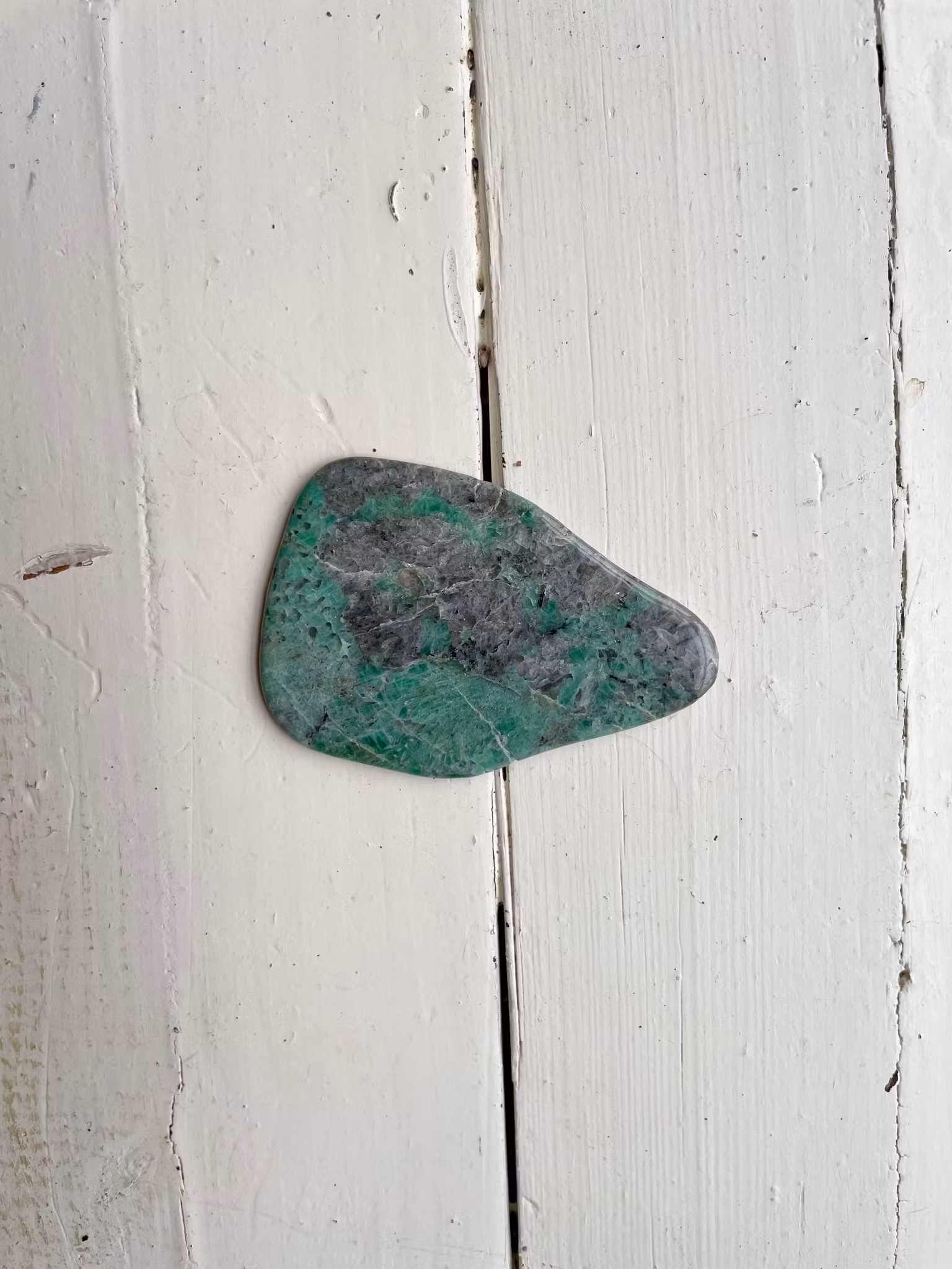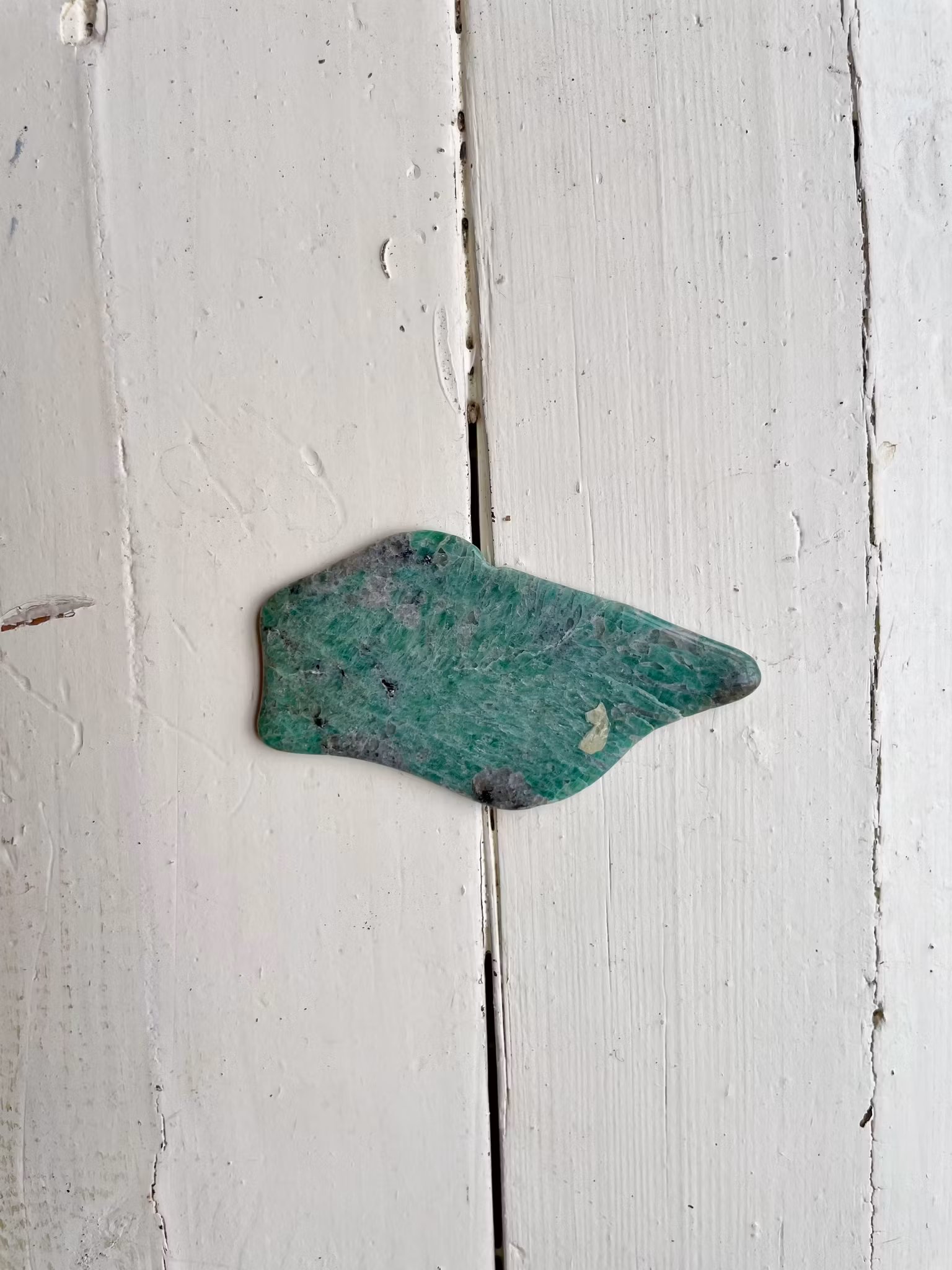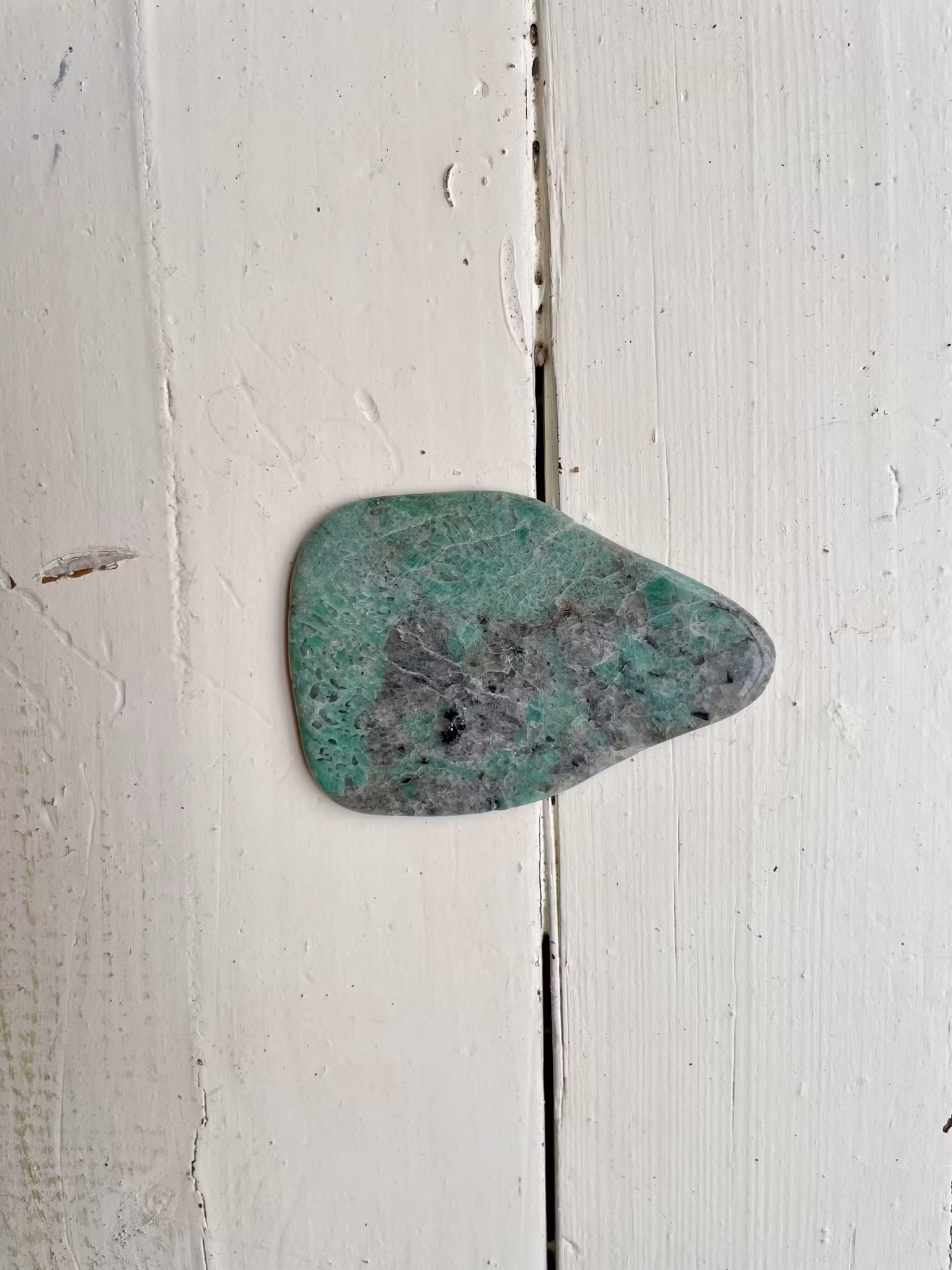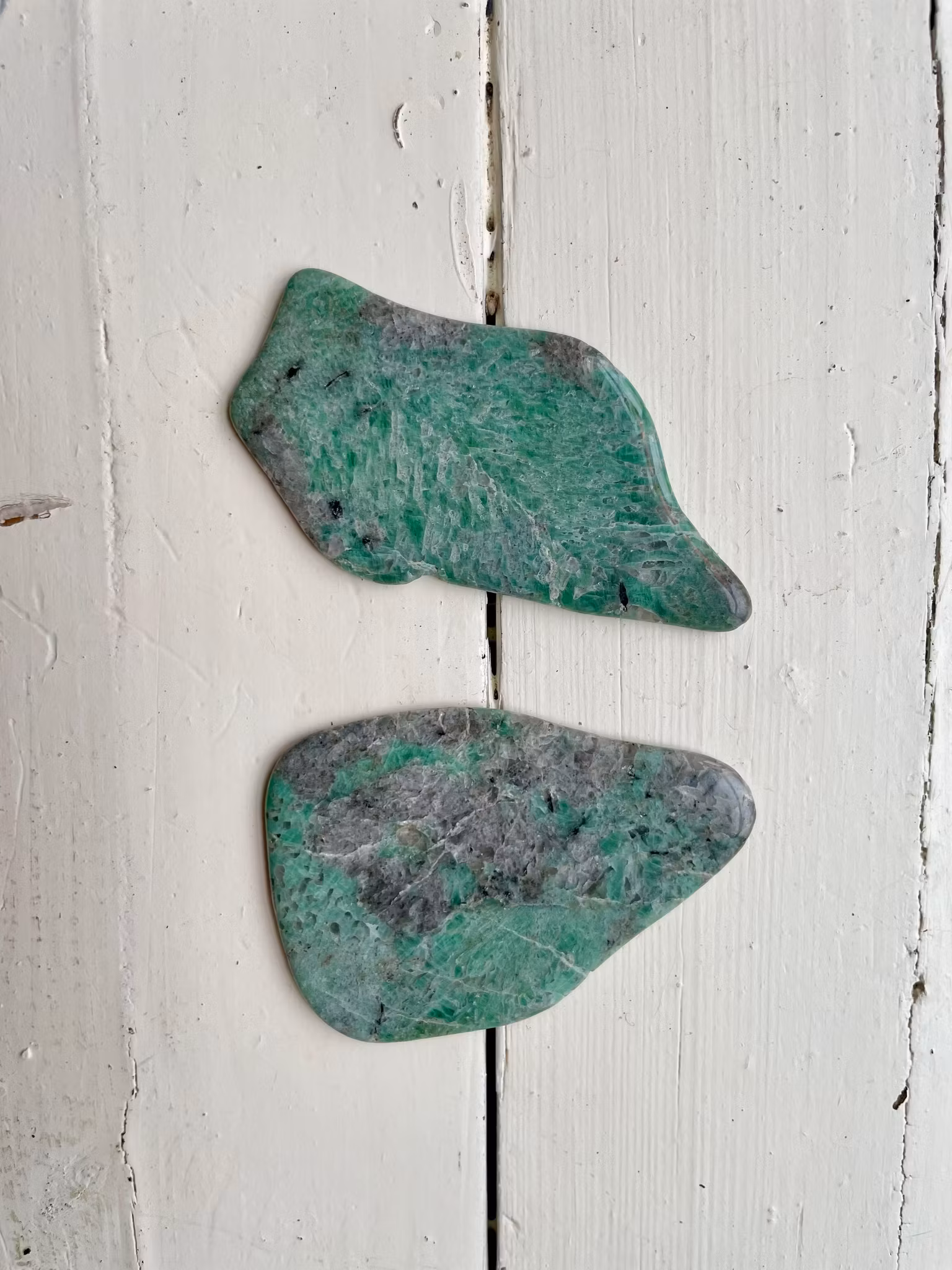 Fina polerade amazonit skivor. Kristallerna är upphittade här i Sverige i en Zinkgruva.